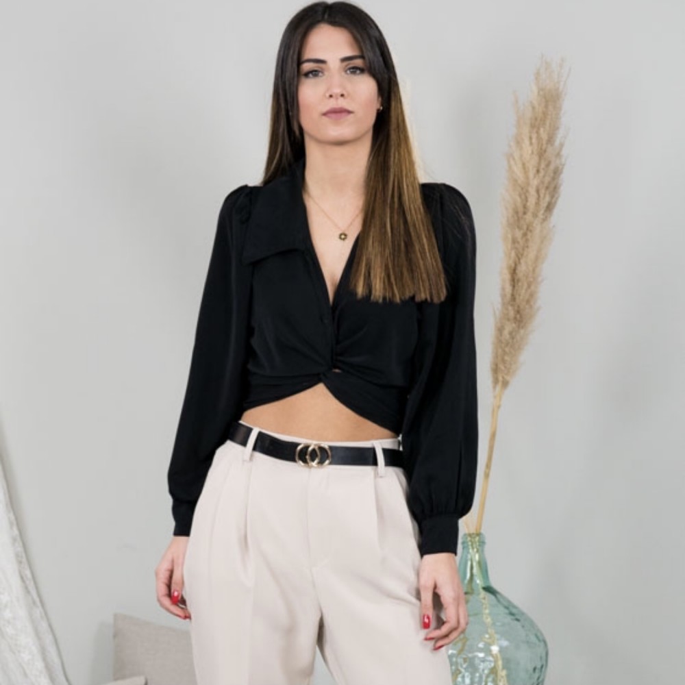 Blusa de viscosa efecto seda. Con escote cruzado, lazo para atar. Sexy, estiloso y perfecto para cualquier look. Para llevar sólo o con lenceras debajo. Te enamorará.